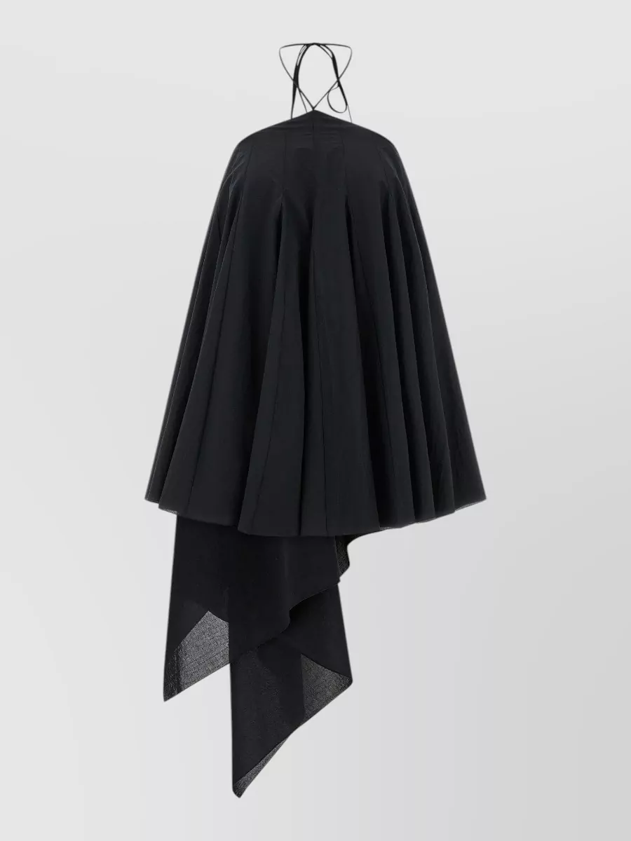 Fits close at the bust with a flowing, relaxed drape through the waist and hips, featuring an asymmetric hem and open back