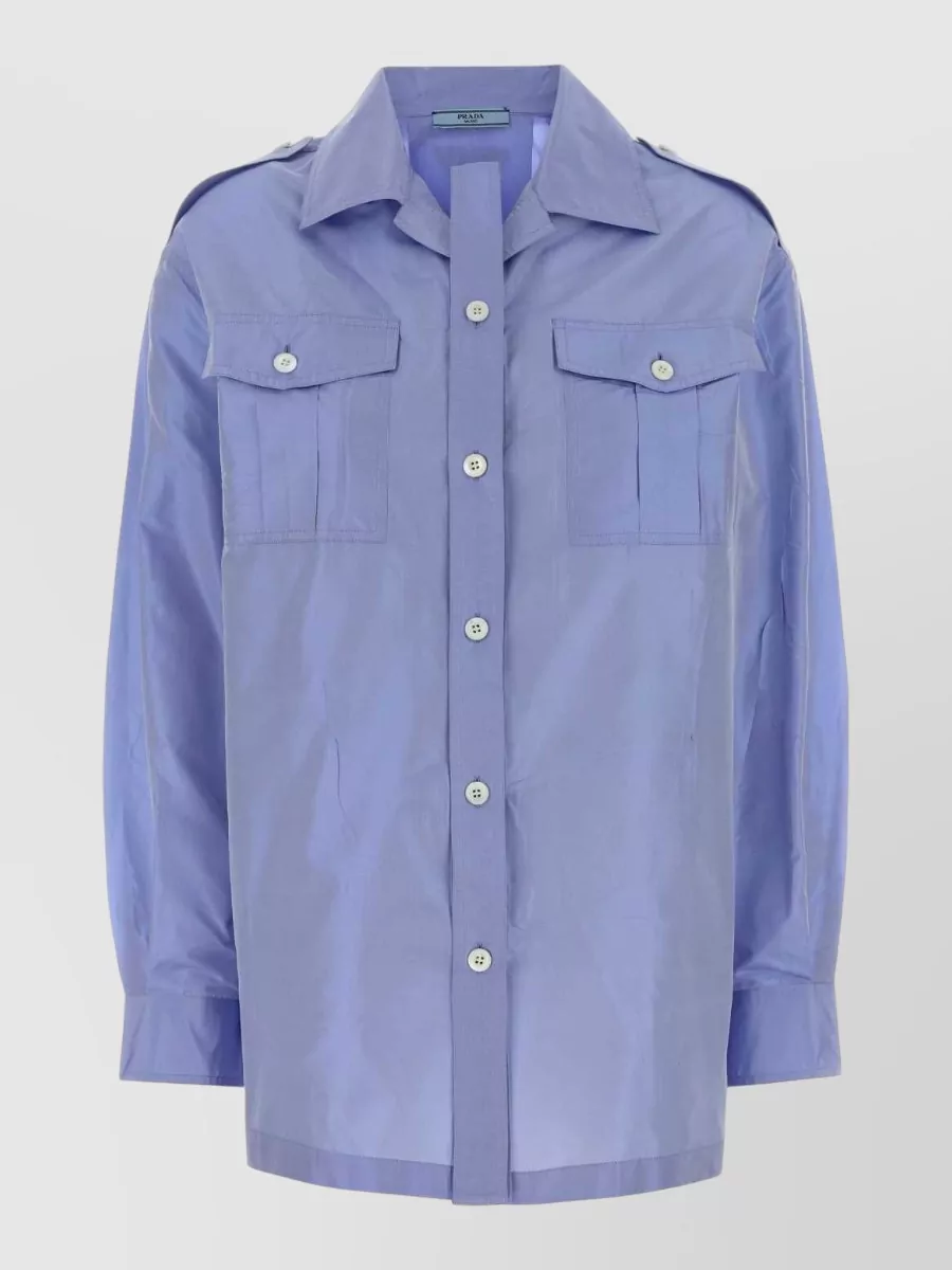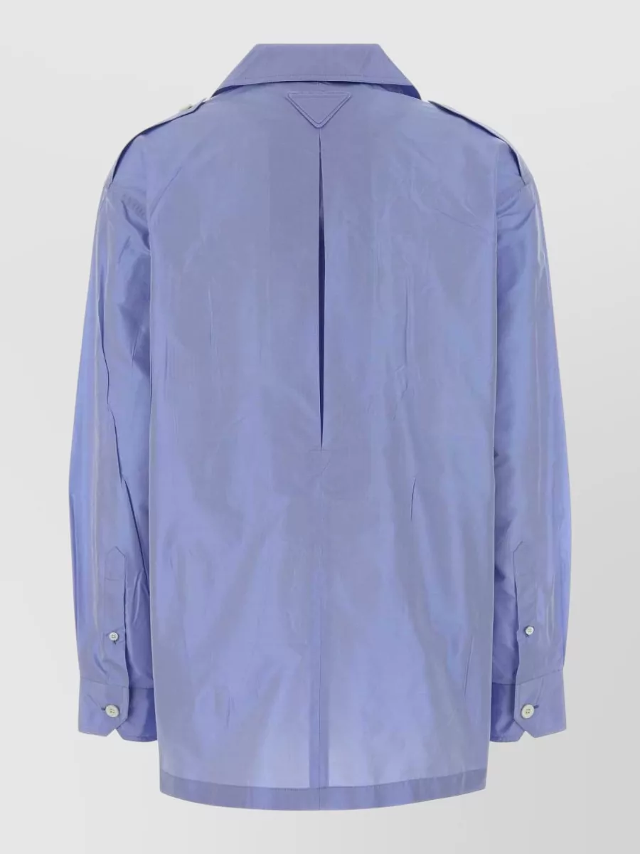 Prada slits hemline loose fit long sleeves cotton poplin buttoned cuffs metal thread trimmings rear yoke pointed collar