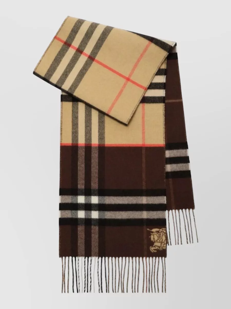 Burberry cashmere scarf embroidered check pattern fringe