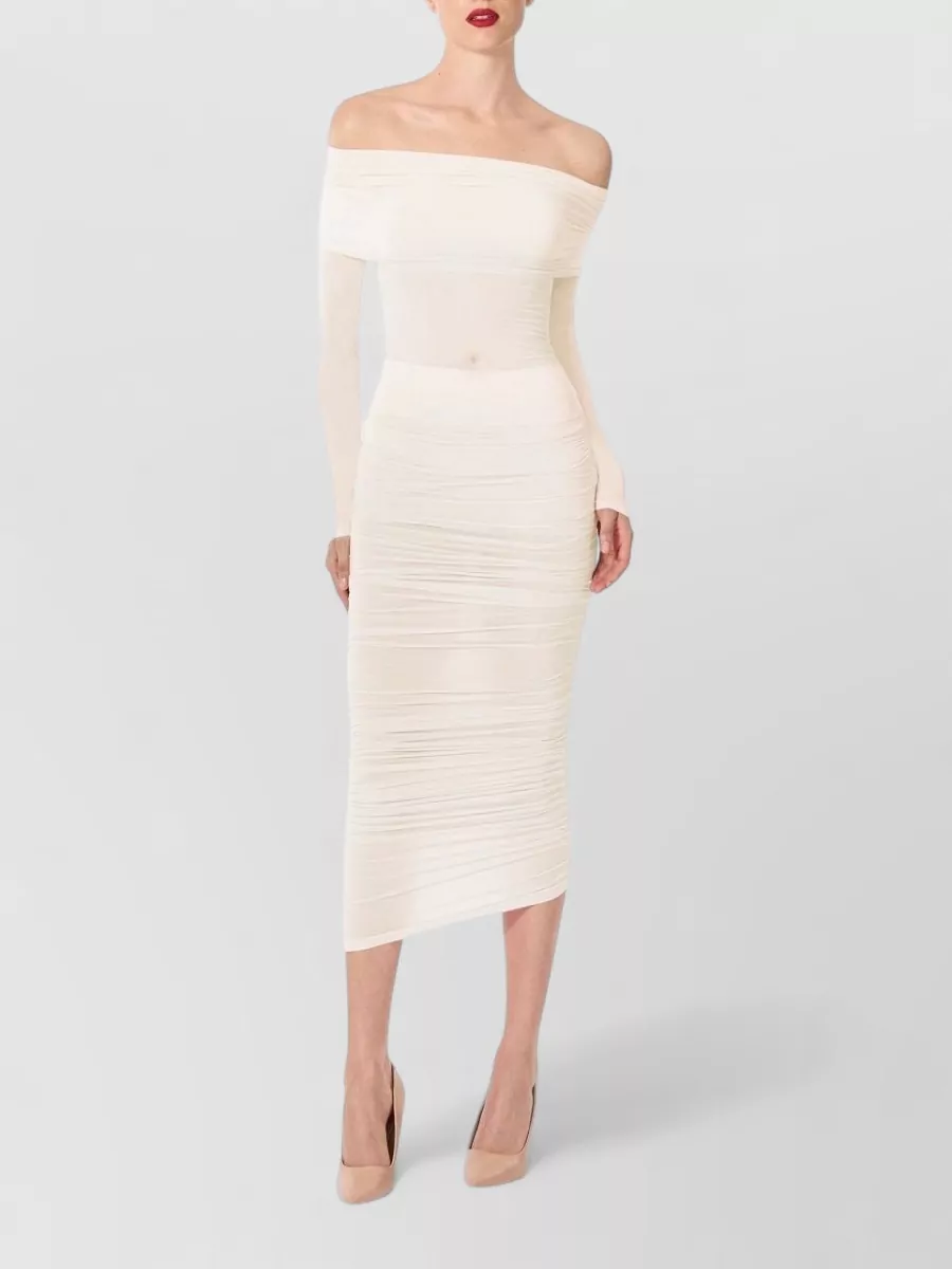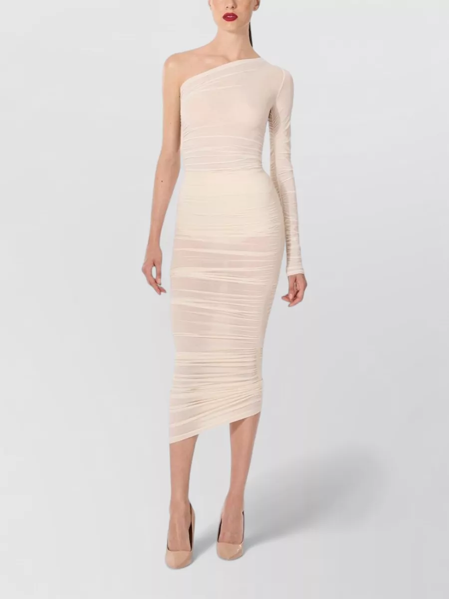 sheer midi dress ruched fitted silhouette