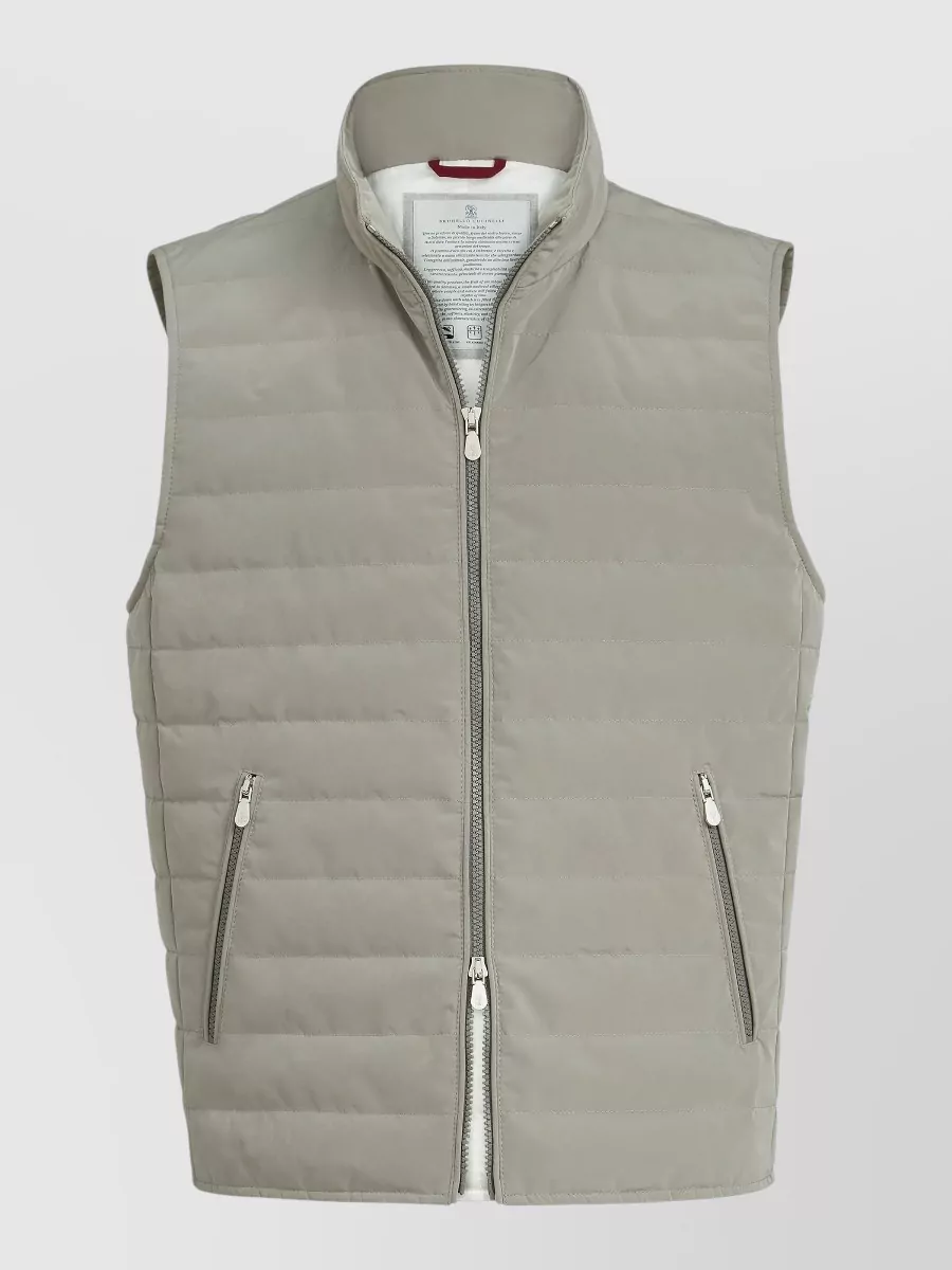 Features a sleeveless, regular-cut body with a high neck that layers comfortably over knitwear or shirts without appearing overly bulky