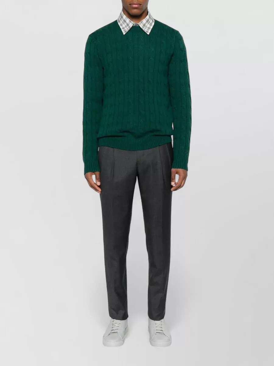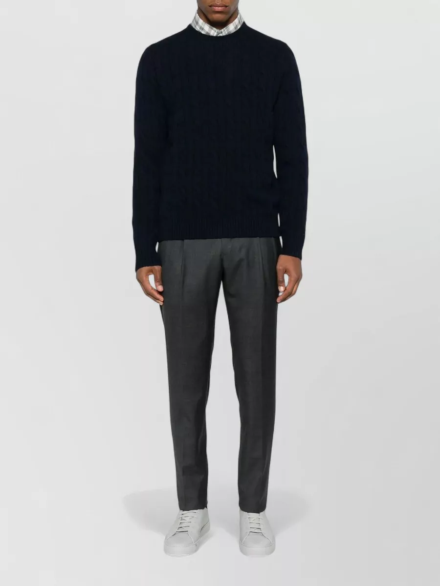 cable knit crew neck sweater with ribbed cuffs