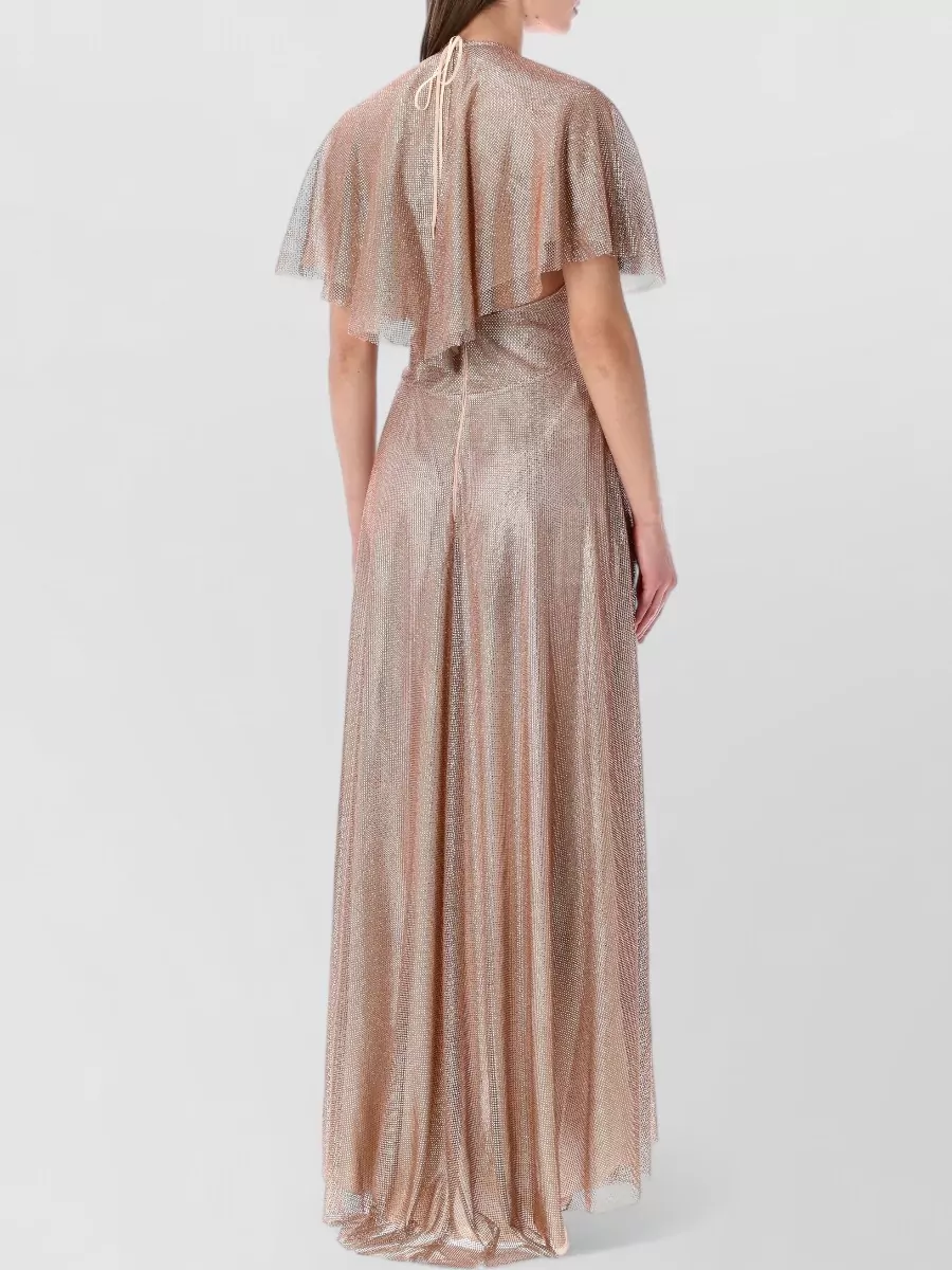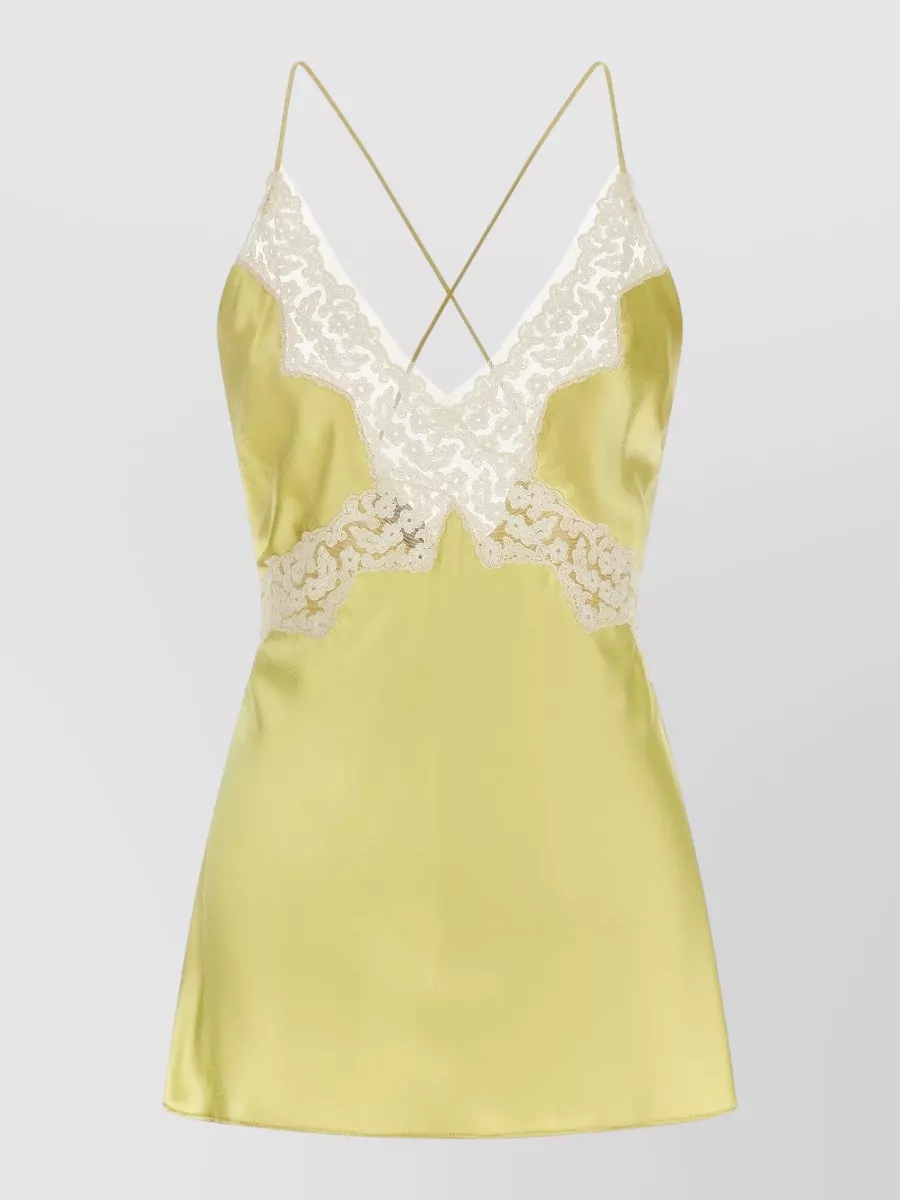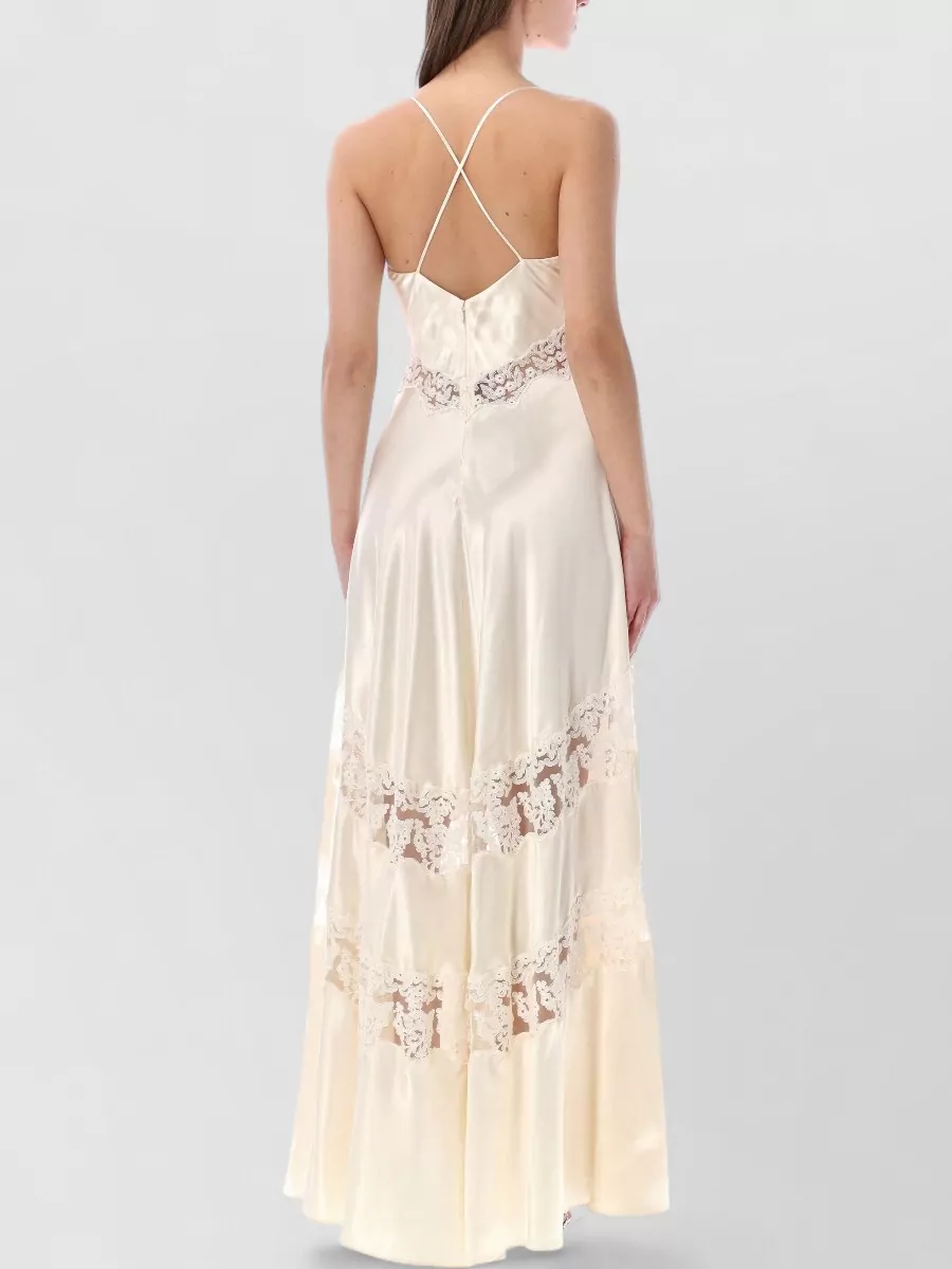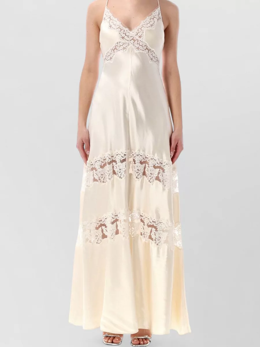 Alberta Ferretti satin dress lace inserts floor length v neckline