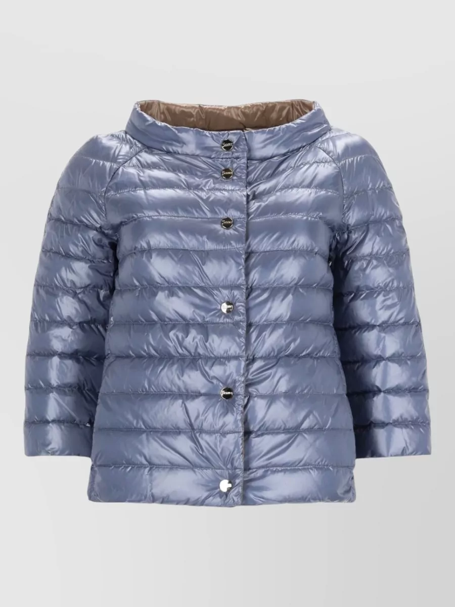 Features a regular puffer silhouette with raglan 3/4 sleeves and a round neckline that sits comfortably around the body