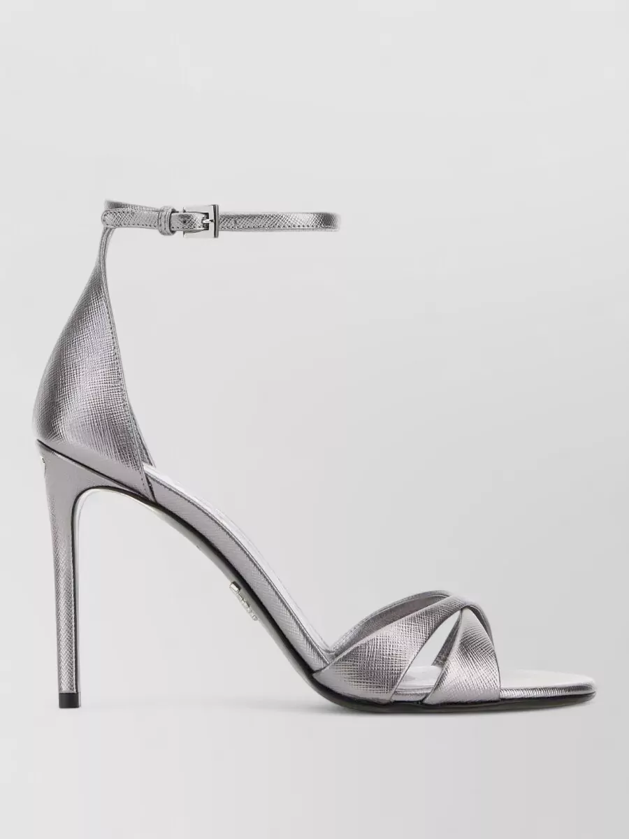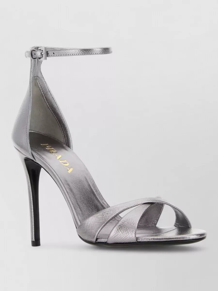 Prada leather sandals featuring buckle and metallic finish