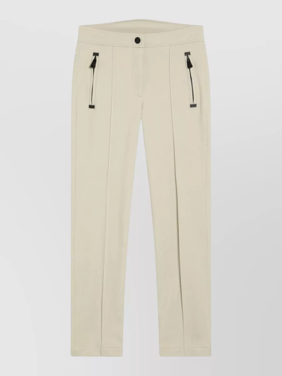 Mid-rise trousers with a slim leg that follows the body closely through the hips and thighs, featuring an elasticated waistband for added comfort