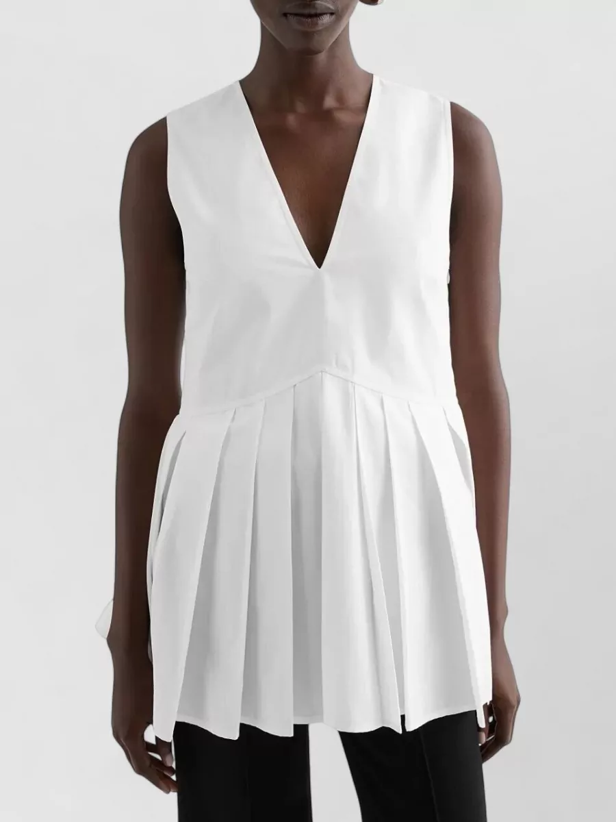 sleeveless v neck top flared hem pleated