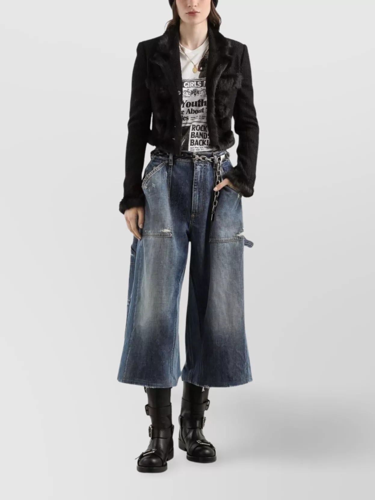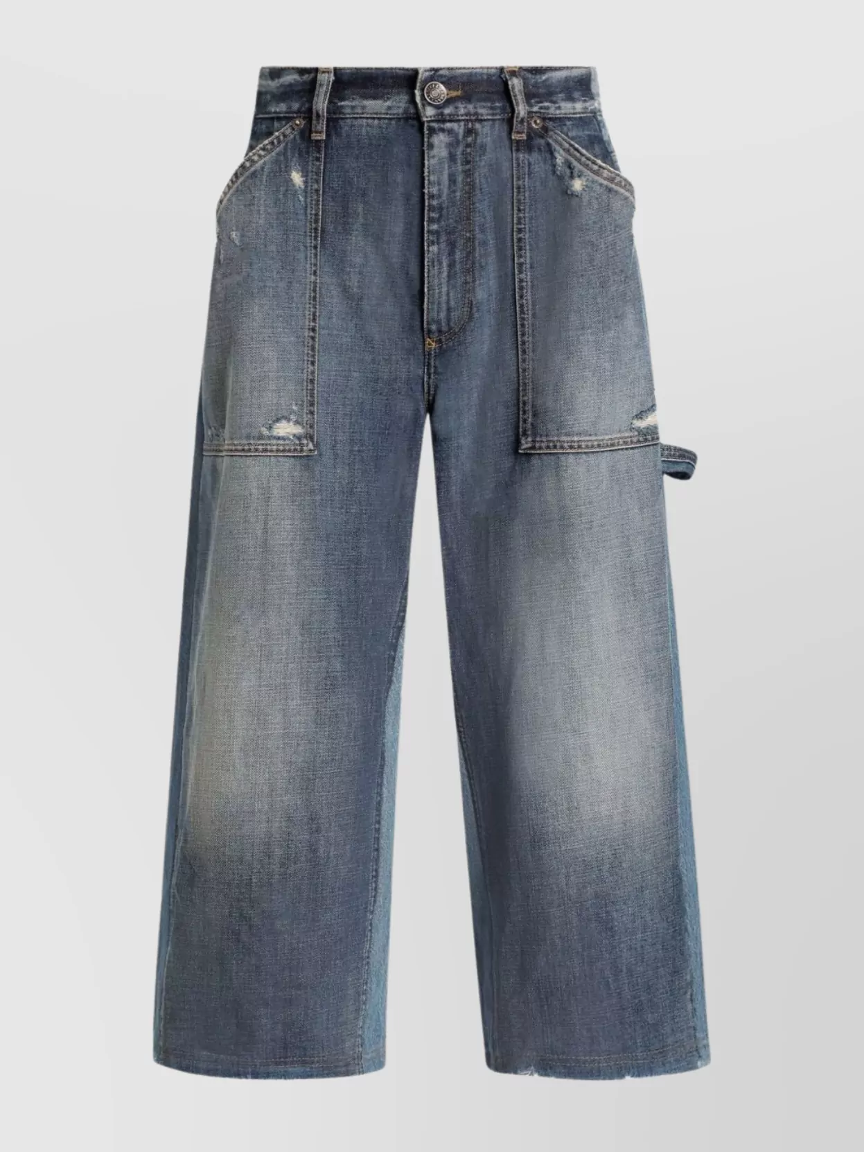 high-waisted distressed denim trousers