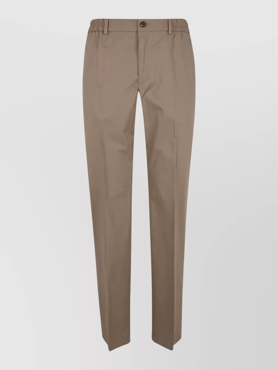 Mid-rise trousers with an elasticated waistband and belt loops that sit comfortably through the waist and fall in a regular, straight leg