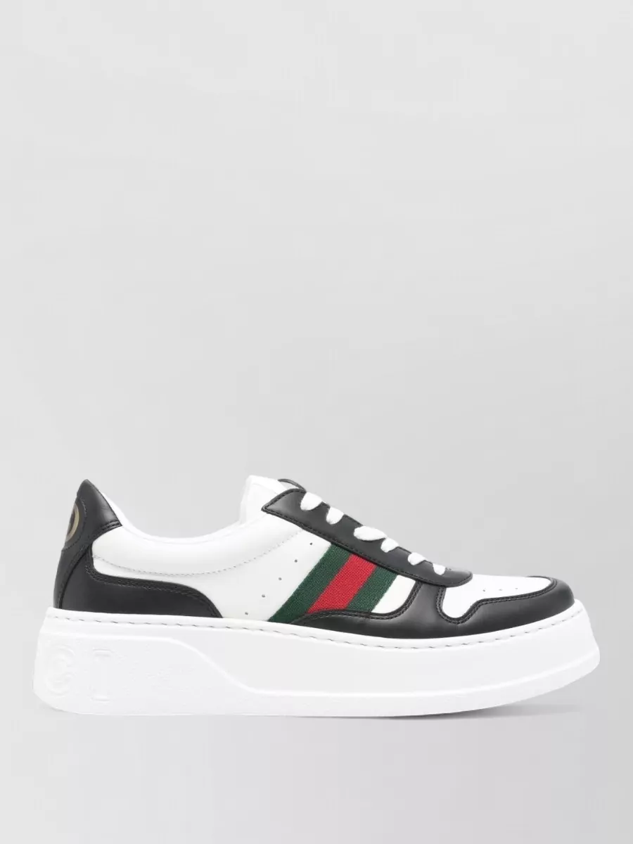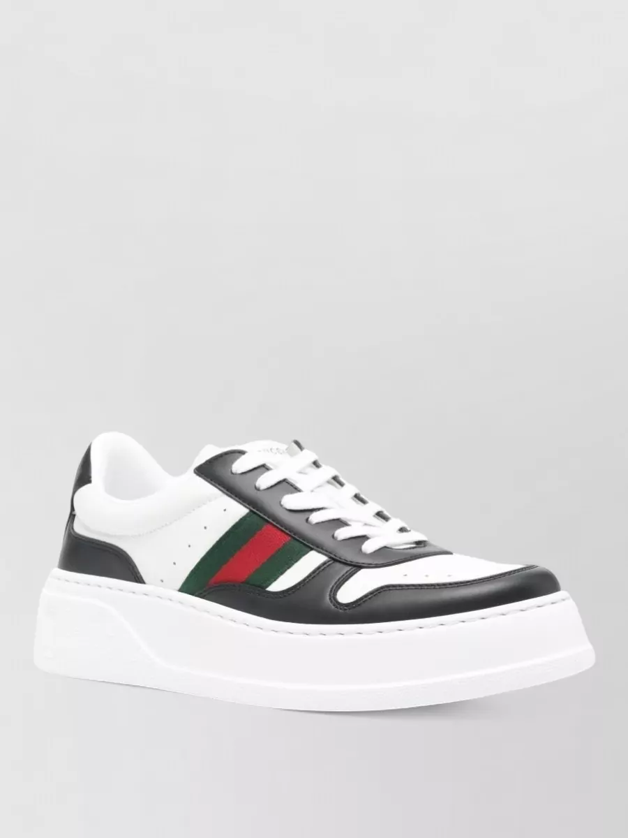 Gucci low-top leather sneakers featuring metallic accents and rubber sole