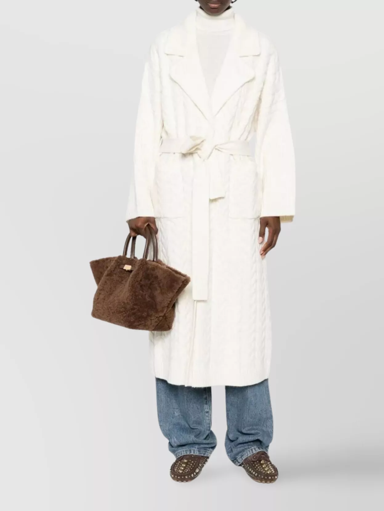 belted cable knit coat with shawl collar