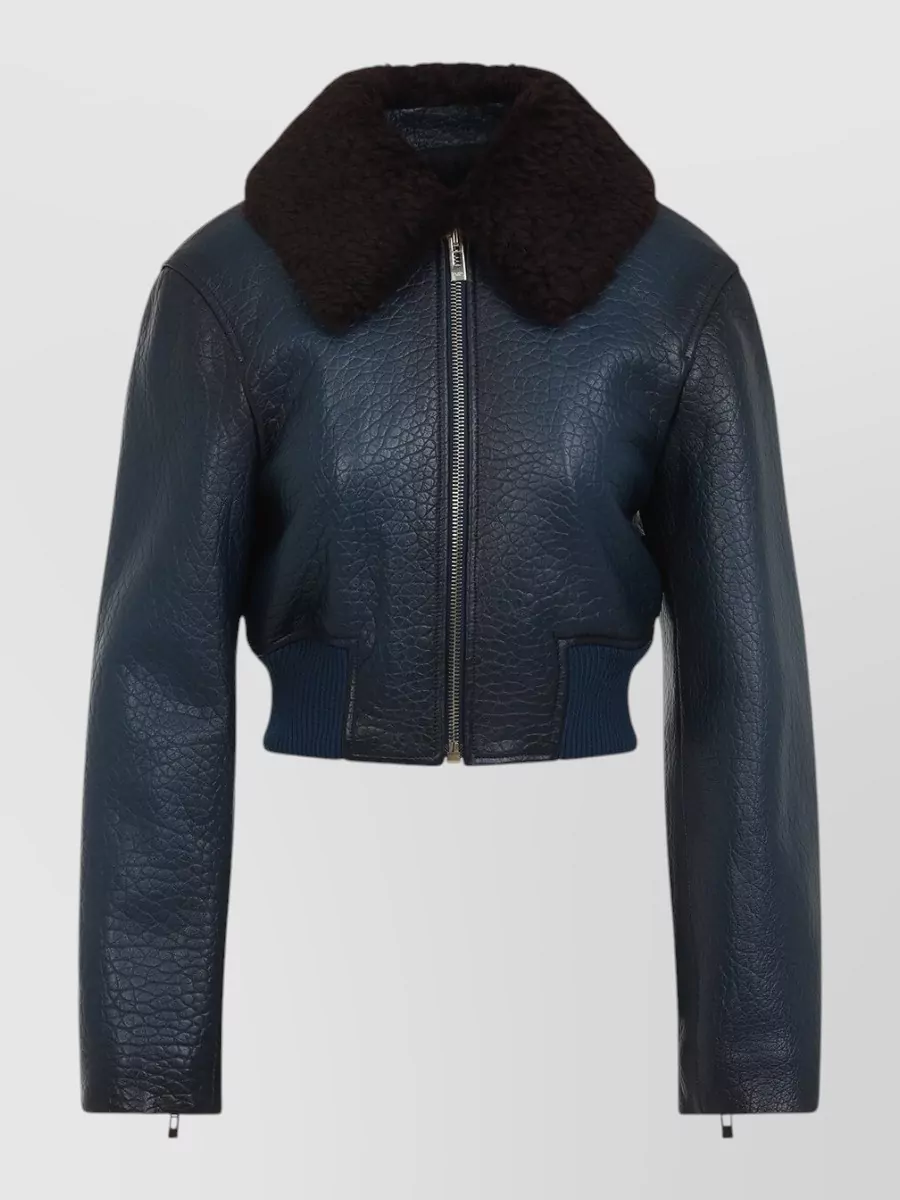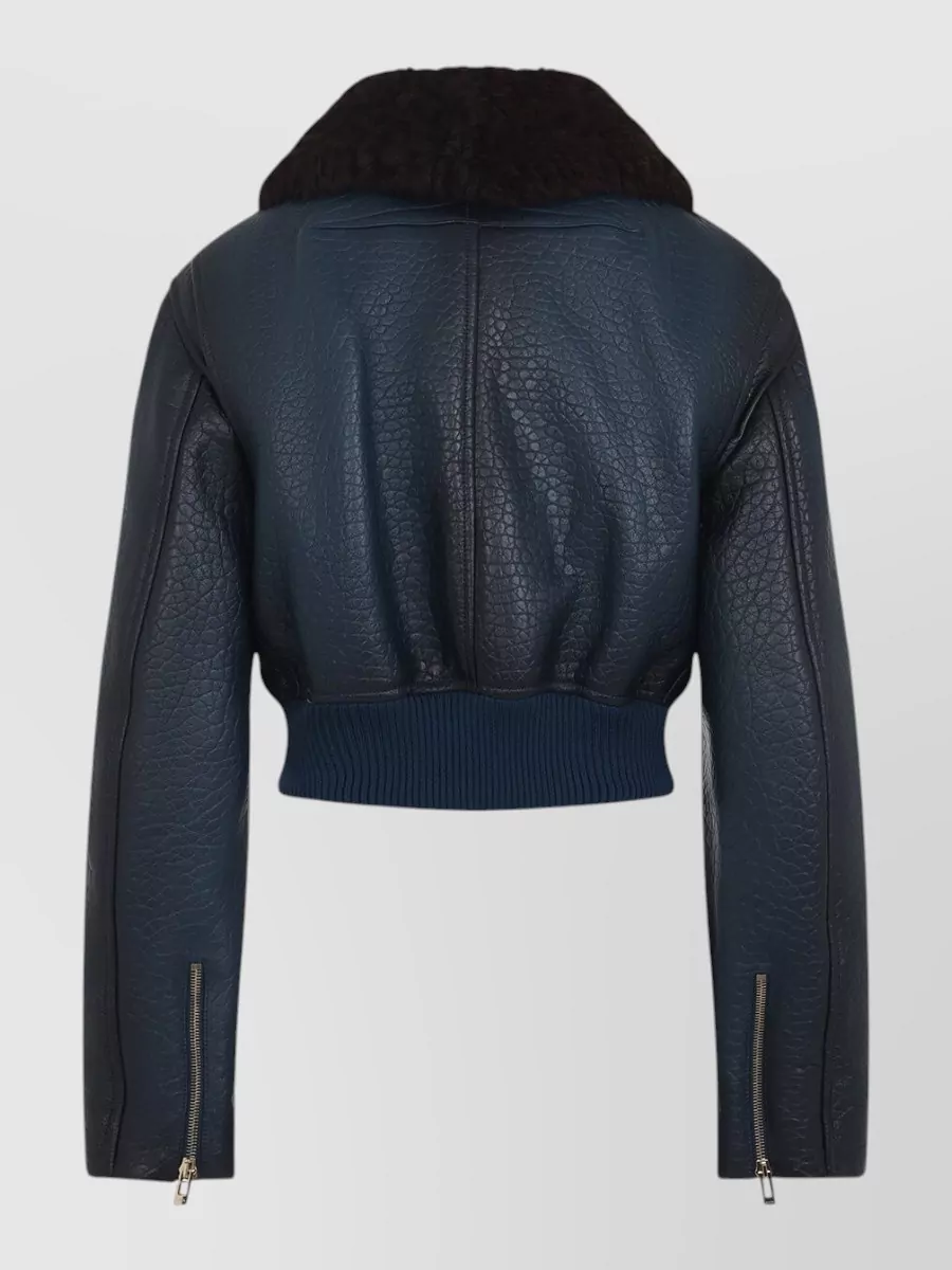 shearling collar textured leather zipped jacket