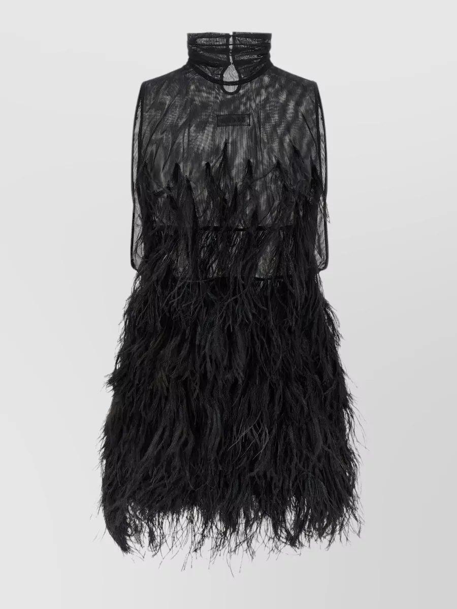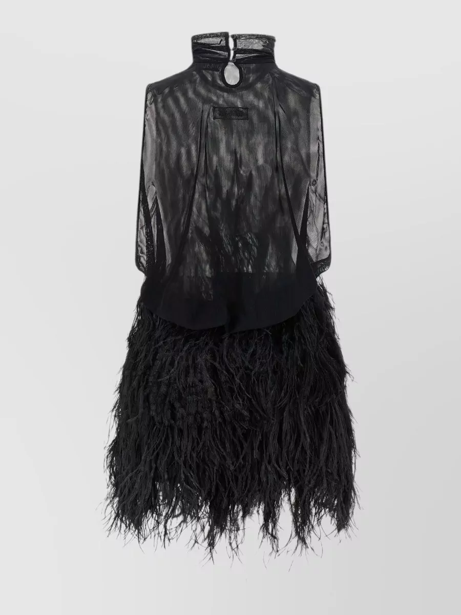 high neck sheer mini dress feather hem