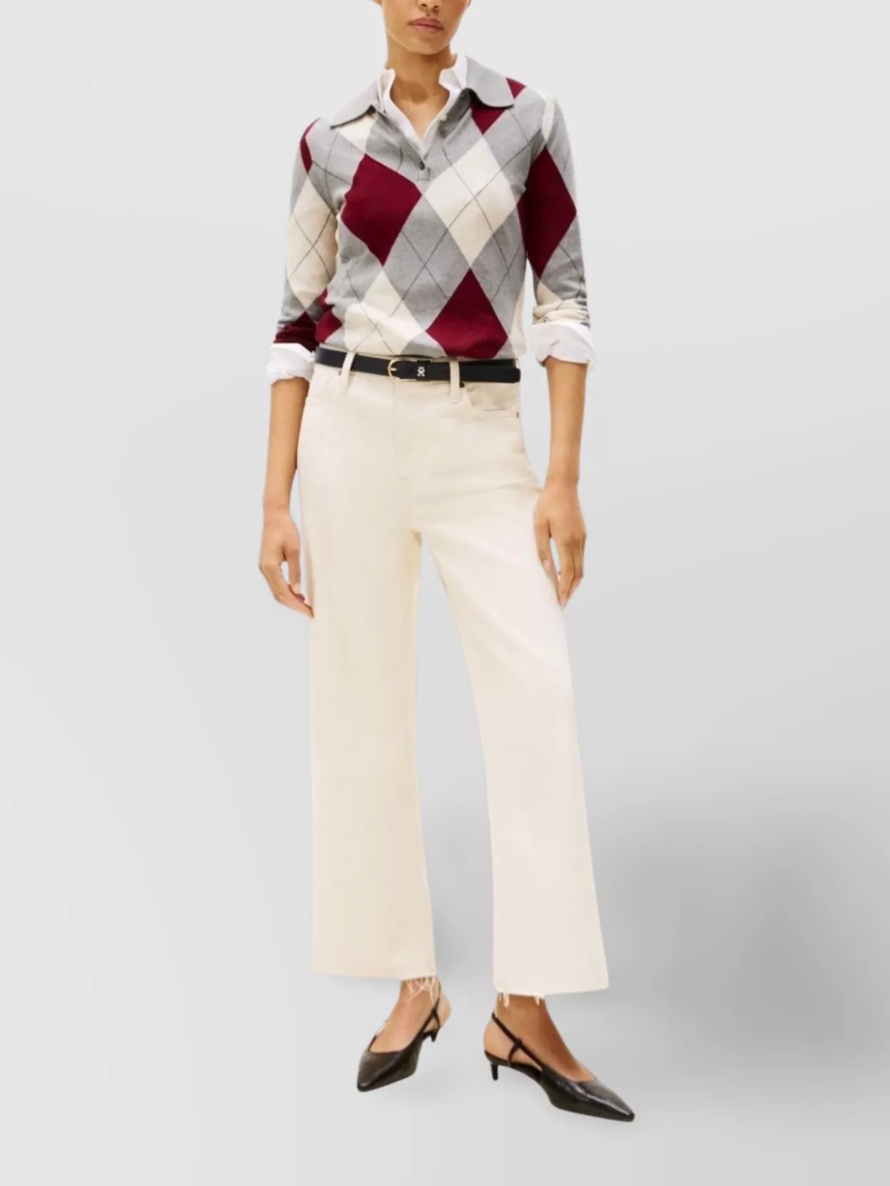 argyle pattern collared cotton long sleeve top
