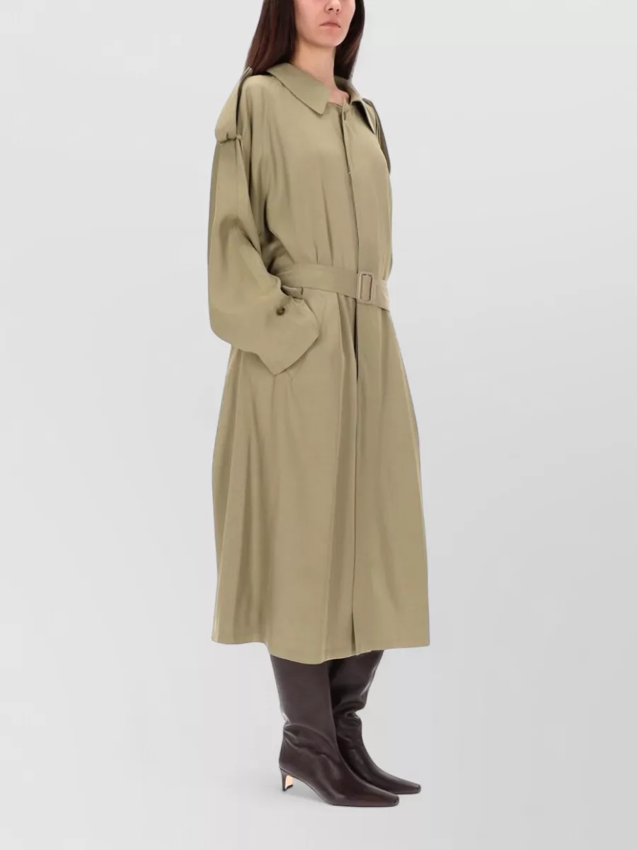 long belted coat featuring storm flap